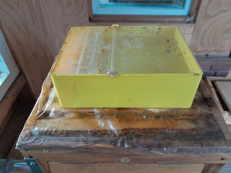 De imkers in de bijenstal hebben zich in de maand september bezig gehouden met het inwinteren van de bijenvolken. In augustus is de laatste zomerhoning geslingerd. De in de bijenkasten verzamelde honing is eigenlijk het wintervoedsel voor de bijen. Doordat deze honing geoogst wordt is de imker verplicht de bijen vervangend voedsel te geven om de winter te kunnen overleven. Ieder bijenvolk heeft 14 kilo in water opgeloste suiker gekregen. Deze wordt in delen in bakken boven in de bijenkast aangeboden (zie foto). De bijen zuigen deze suiker op en dit wordt in de honingmaag van de bij verwerkt tot een soort honing en opgeslagen in de honingraten. Zo hebben de bijen voldoende voedsel om een strenge winter goed door te kunnen komen.