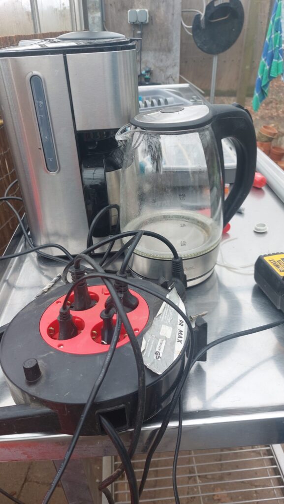 Behalve de heerlijke gourmetgeuren roken we nog wat anders. Toen zagen we uit de verlenghaspel rook omhoog kringelen en vlak daarop zei de aardlekschakelaar ‘poef’. Heb je dat ook wel eens meegemaakt? Zeker het snoer van de haspel niet helemaal uitgerold? De beheergroep zag iets dergelijks in de kas. Om de voorkomen dat het ook hier mis zou gaan, werd op deskundige wijze een serie randgeaarde wandcontactdozen aangesloten. Zo gingen de mannen met een doos vol elektrospullen meer kritische punten langs. Alles voor veiligheid!
