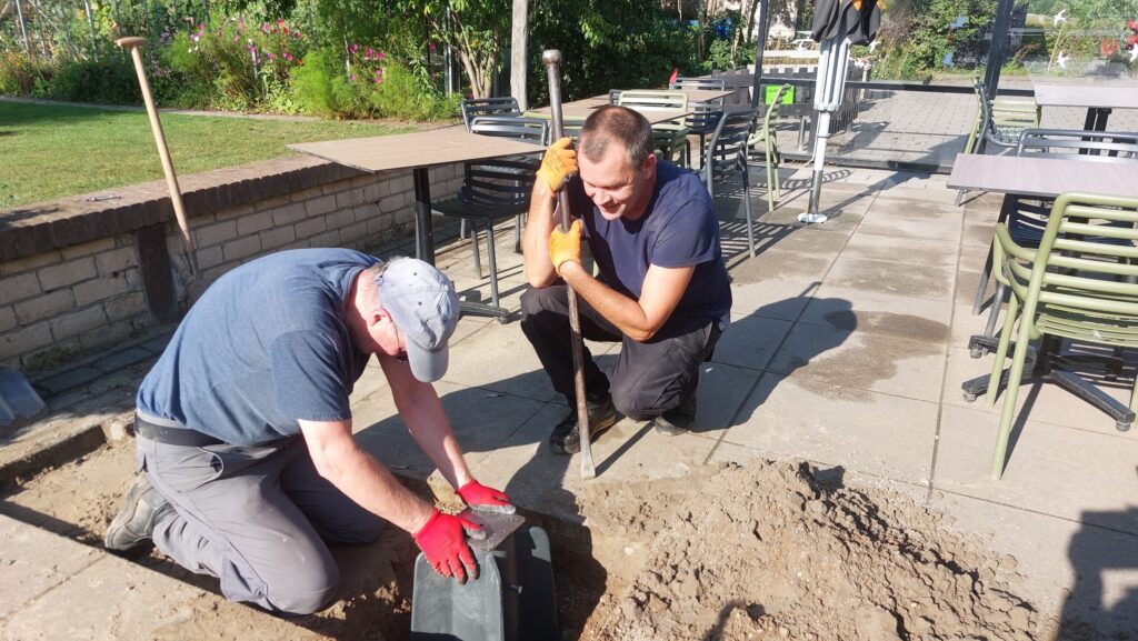 Een vrijdagmorgen op de Landerij. Het grote terras is voor publiek niet toegankelijk. Het klusteam zwoegt onder de stralende zon. Wordt dit een gevalletje Putje graven, Tentje bouwen, Tukkie doen? Nee, zeker niet. Vervang het tentje door vier parasols: die worden stevig in de grond verankerd. En dat valt niet mee. Onder de terrastegels ligt een dikke laag puin en daar moet zeker vijftig centimeter diep een gat in worden gebikt. Met allerhande gereedschap en overduidelijk flink wat ervaring worden de ondergrondse houders nauwkeurig waterpas in positie gebracht. De kunst is om de vier parasols keurig in het lood én in lijn met elkaar geplaatst te krijgen. Kom zelf op een zonnige dag maar even checken of dat gelukt is.