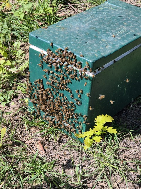 Tijdens “imker bij de stal” in april zagen wij dat het bijenvolk in de warrékast (met de doorkijkraampjes) ging zwermen. Het was een drukte van jewelste voor de kast. Als snel hing de zwerm aan een tak vlakbij de bijenstal. We hebben de zwerm makkelijk kunnen scheppen. De bijen in de zwerm zullen niet snel steken, ze hebben immers geen kast om te beschermen. Voorzichtig vegen we de bijen in een bak, als de koningin in de bak zit gaan de werkbijen “stertselen”. Dat is een soort “twerken”, bijen dansen met hun achterkant om de andere bijen te vertellen dat daar de koningin is. Na enige tijd zitten alle bijen in de bak. We kunnen nu de bijen in een bijenkast doen. Zo hebben we weer een extra bijenvolk.